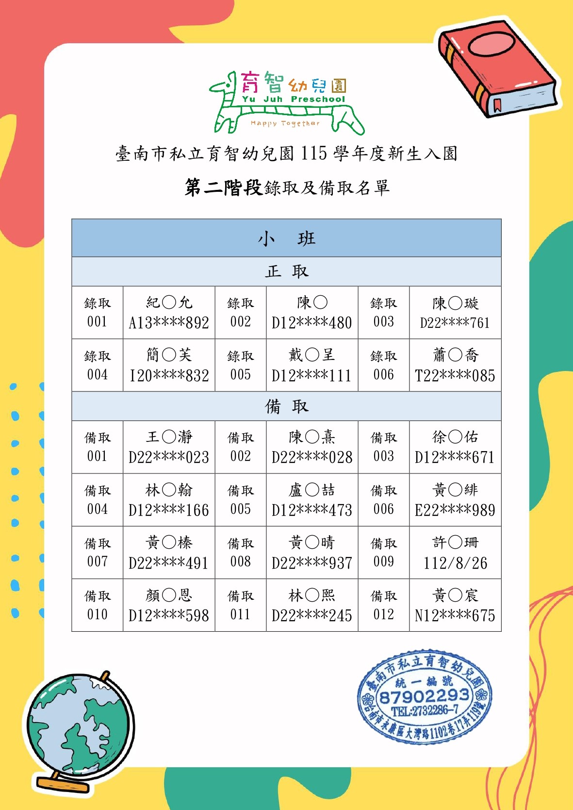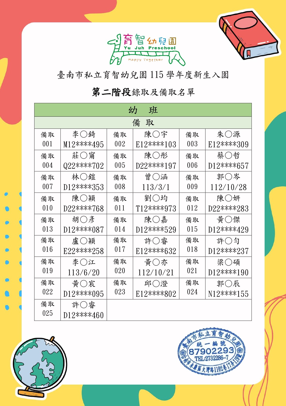115學年度新生入園錄取名單(第二階段)