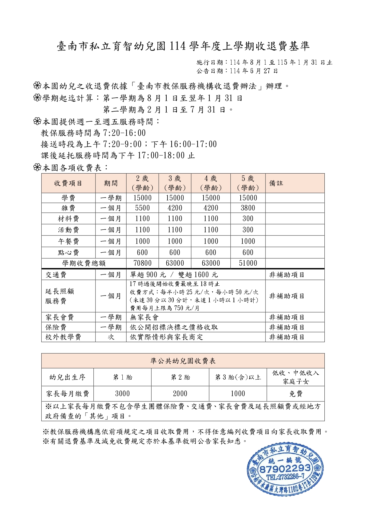 114學年度上學期收退費基準(第1次公告)